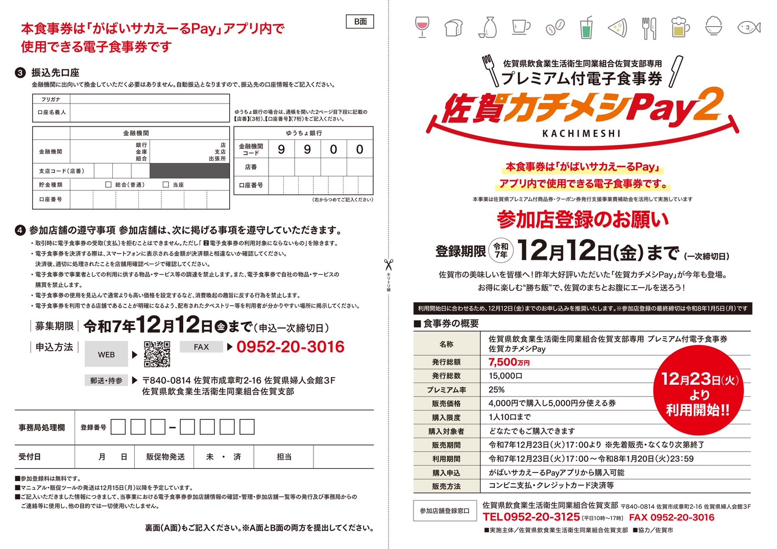 佐賀カチメシPay2(プレミアム付電子食事券) 2025/12/09 昨年に続いてのプレミアム付電子食事券(4000円で購入し5000円分使える券)です! 購入はお早めに □販売期間 令和7年12月23日(火)17時より ※先着販売・なくなり次第終了 □利用期間 令和7年12月23日(火)17時~ 令和8年1月20日(火)23時59分まで ※チラシ お知らせ一覧へ戻る